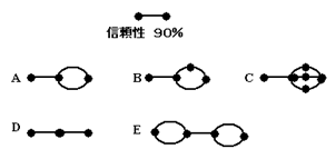 - 次の図に示されるシステムの設計を考える。各システムは、節点を連結する線要素から構成されており、節点から節点に進むことのできる可能性(要素の信頼性)は90%である。ここで、それぞれのシステムを用いて左端から右端の節点に進むことのできる可能性、すなわち、システム全体の信頼性が最も高いのはどれか。
