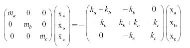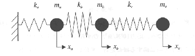 とすると理解しやすい。右辺第一項は、左のばねの伸びに伴い質点maが受ける力である。ばねの左端は固定されているので、右端の変位がそのままばねの伸びを示す。