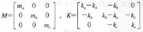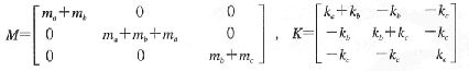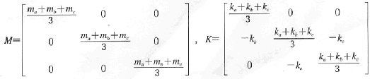 第二項は、中央のばねから受ける力であるが、中央のばねは両端が変位するので、ばね自体の伸びは変位の差で表され、両端の変位が等しければ単なる移動であって伸び縮みは生じていないことになるので、第二項の値は0となる。 第二式、第三式も同様に書き換えて考える。