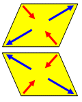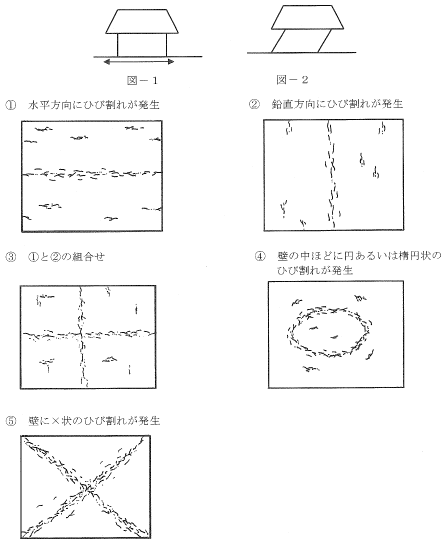 地震時には、家屋が図2のような形に変形しようと左右に揺れるため、引張応力と圧縮応力は図のように対角線方向に働きます。問題文にあるように、「ひび割れが主引張応力と直交する方向に発生」するので、選択肢(5)のような対角線を結んだような亀裂ができます。実際、阪神大震災ではこういう亀裂ができています。 | ![]() |