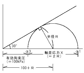 圧密後、非排水条件で三軸圧縮試験をしていますから、この試験は圧密非排水、すなわちCU試験、さらに間隙水圧を測定しながらですから、CUbar試験です。 右図で解説します。求めたい軸差応力は図のようにモール円の直径です。 初期有効拘束圧は200kPaでしたが、過剰間隙水圧100kPaが発生したため、せん断時の有効拘束圧は200−100=100kPaがσ3となります。 しかがって、モール円はσ3(100kPa)だけ原点から離れたところにあります。 有効応力表示したφ’が30°ですから、原点を通るモール円の接線の傾きがφ’=30°となります。 したがって、半径R÷原点とモール円中心の距離(=100+R)=sin30°となります。 sin30°=1/2ですから、R÷(100+R)=1/2より、R=100、よって軸差応力=2R=200kPaとなります。 よって正解は(4)です。 |