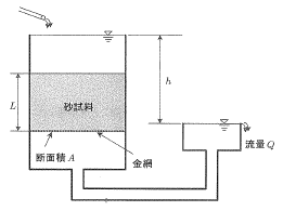 4-1 下図に示すように、断面積Aの容器に長さLの砂試料を設定し、上部の水面を一定位置に保ちながら給水を行った。試料を通過した水をパイプを通して小さな容器に導き、この容器の水位を一定に保ちながらあふれる水の量を測定した(木頭差はhである)。ある程度水を流して定常状態になったときを見計らって、あふれる水の量を測定すると、単位時間当たりQであった。ダルシーの法則が成り立つとすると、この砂試料の透水係数だは次のうちどれか。ただし、砂試料の下には金網が挿入されているものとし、図示の位置に固定されているものとする。また、水が受ける金網の抵抗は無視するものとする。