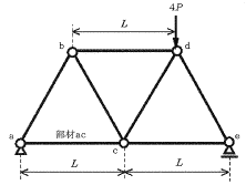 4-6 下図に示すように、トラスの節点dに荷重4Pが作用している。部材acに発生する軸力として、正しいものは@〜Dのうちどれか。ただし、下図のトラスの各節点を結ぶ部材の長さは全てLであり、軸力は引張りを正とする。