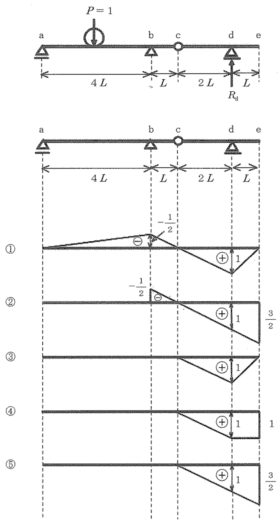 4-7 下図に示すような点cにヒンジを有するゲルパー梁aeがある。支点dの支点反力Rdの影響線として、正しいものは@〜Dのうちどれか。ただし、支点反力Rdは上向きを正とする。