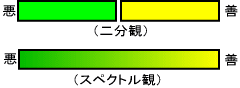 線引き問題とは、まさに問題文に書かれているとおりです。右図において、上のように、どこかで善悪の区別がスパッとついている(二分観)と悩まずに済むのですが、下のように善から悪へ徐々に変わっていく、あるいは疑わしさが徐々に濃くなっていく(スペクトル観)と、中間のグレーゾーンでは判断がつきにくくなります。