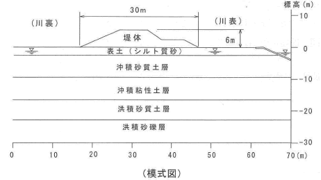 - ある河川の河口から上流5kmの区間で、大規模地震(レベル2地震動)が作用したときの堤防の地震対策の必要性を判断するため、堤防に対する耐震性能照査の実施が計画されている。模式図は河口部付近の状況を示したものである。なお、対象区間の堤防形状は同一であり、堤体の土性も一様であると仮定する。このような状況を踏まえ、以下の問いに答えよ。なお、解答は各問いにつき1枚程度を目安とする。