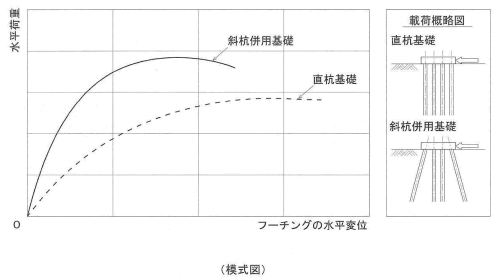 - 同じ杭本数の直杭基礎と斜杭併用基礎のフーチングに水平力を載荷したところ、模式図に示す荷重〜変位曲線が得られた。この曲線から、水平力を受ける直杭基礎と斜杭併用基礎の挙動について説明せよ。