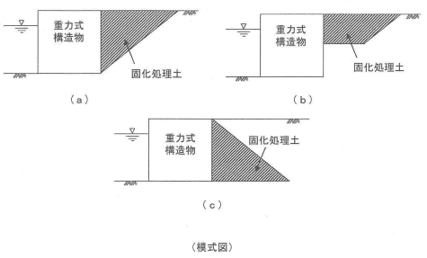 - 固化処理土を重力式構造物(前面水深10m程度)の裏込めに用いる際の断面形状の代表的なものとして、模式図に示す3つがある。それぞれの裏込め断面を設計する際の考え方を説明し、施工上の制限を踏まえて長所と短所を説明せよ。