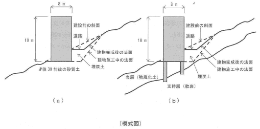 - 模式図(a)に示すような直接基礎で支持した建物を建設する際、施工手順を踏まえた切り盛り造成計画及び基礎構造設計の考え方と留意点を述べよ。