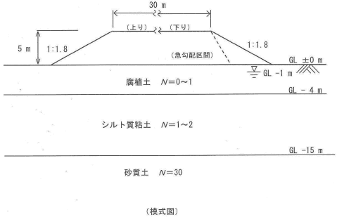 - 模式図に示す軟弱地盤上に、高さ5mの道路盛土を構築する計画がある。当地区において無対策では盛土の安定を満足できないことが分かっており、軟弱地盤対策が必要である。このとき、以下の問いに答えよ.なお、解答は各問いにつき1枚程度を目安とする。