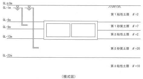- 当該地盤が模式図のように推定されている場合、ボックスカルバート施工時における山留めの安定上の留意点を2つ挙げ、対処すべき方策を述べよ。また、本体完成後について検討すべき課題を2つ挙げ、問題が生じると仮定した場合の対処すべき方策を述べよ。