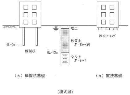 - 平坦な地表面上の比較的小規模なRC構造物(地上3階、地下なし、建物平面15mx20m)に発生した建物傾斜の修復について、以下の問いに答えよ。模式図の地盤条件は共通とし、2つの基礎形式を想定する。なお、解答は各問につき1枚程度を目安とする。