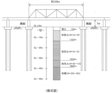 - 市街地周辺部において、模式図に示すような全長約100mの跨道橋の計画があり、橋梁区間の中央地点において実施されている事前調査により基礎構造を完全支持杭にて検討している。橋脚下端に作用する鉛直力は常時で約5、000kNである。基礎に関連した以下の問いに答えよ。なお、解答は各問いにつき1枚程度を目安とする。