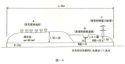 - 上記(2)の耐震性能照査を合理的に行うための地盤調査計画(調査手順、調査・試験項目、内容、方法、数量等)を立案せよ。また、実施した調査結果の整理及びとりまとめに当たっての留意点を説明せよ。