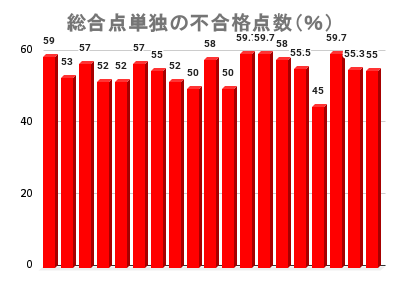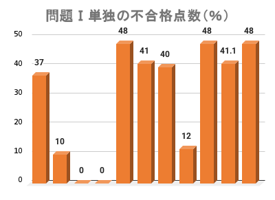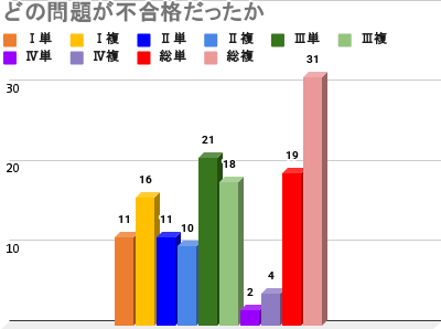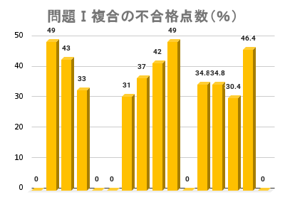 - 複合(問題Ⅰ以外にも不合格があった人)の内訳は、問題Ⅰ・Ⅲ・総合点が不合格だった人が3人、問題Ⅰ&Ⅱ&総合点が2人、問題Ⅰ&Ⅲ&Ⅳ&総合点が1人、問題Ⅰ&Ⅲ(総合点は60%以上)が1人で、残り9人は問題Ⅰ&総合点が不合格でした。つまり、問題Ⅰが50%に満たないと総合点も60%取れないことが多いということです。