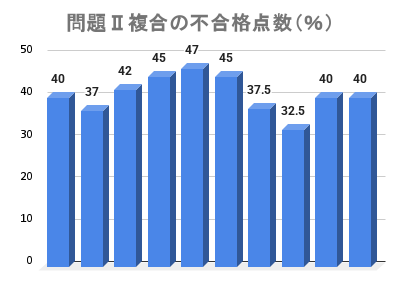 - 複合の(問題Ⅱ以外にも不合格があった人)の内訳は、問題Ⅰ・Ⅱ・総合点が不合格だった人が2人で、残り8人は問題Ⅱ&総合点が不合格でした。特に問題Ⅱと総合点のみ不合格の人は、総合点が57点以上の人が大部分で、おそらく問題Ⅱが50%を超えていれば総合点も60%に達していたものと思われます。