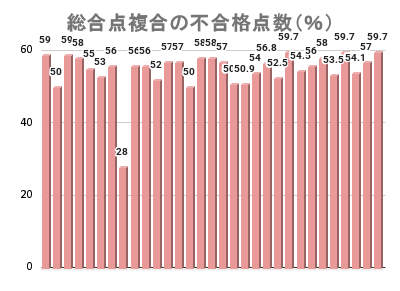 - 一方で、複合でも50~59点ばかりであることから、複数の問題が極端に低かったという人は少ないことが分かります。どこかの問題が極端に悪くても他の問題でカバーすれば総合点は50点は取れるような配点だということです。